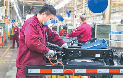 4月16日,工人在山东省青州市一家汽车制造企业总装车间内进行组装作业。