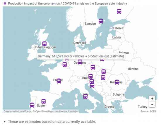 欧洲汽车工业协会在其官网用交互地图显示了汽车业遭受的冲击。截至6月,欧盟范围内汽车产量损失已达2446344辆,其中德国616591辆。不过该协会数据也令人看到了好转迹象,从5月底开始,德国、西班牙、法国、捷克、斯洛伐克等汽车制造大国的新增损失均为0,表明汽车业已开始恢复生产。