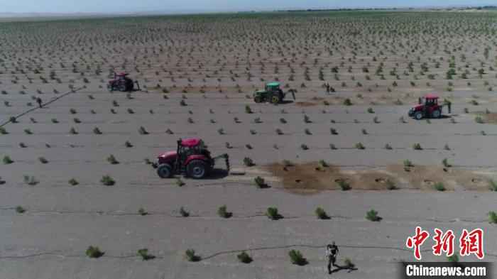 图为金塔县民众在戈壁荒滩机械化种植梭梭树场景。 金塔县委宣传部供图 摄