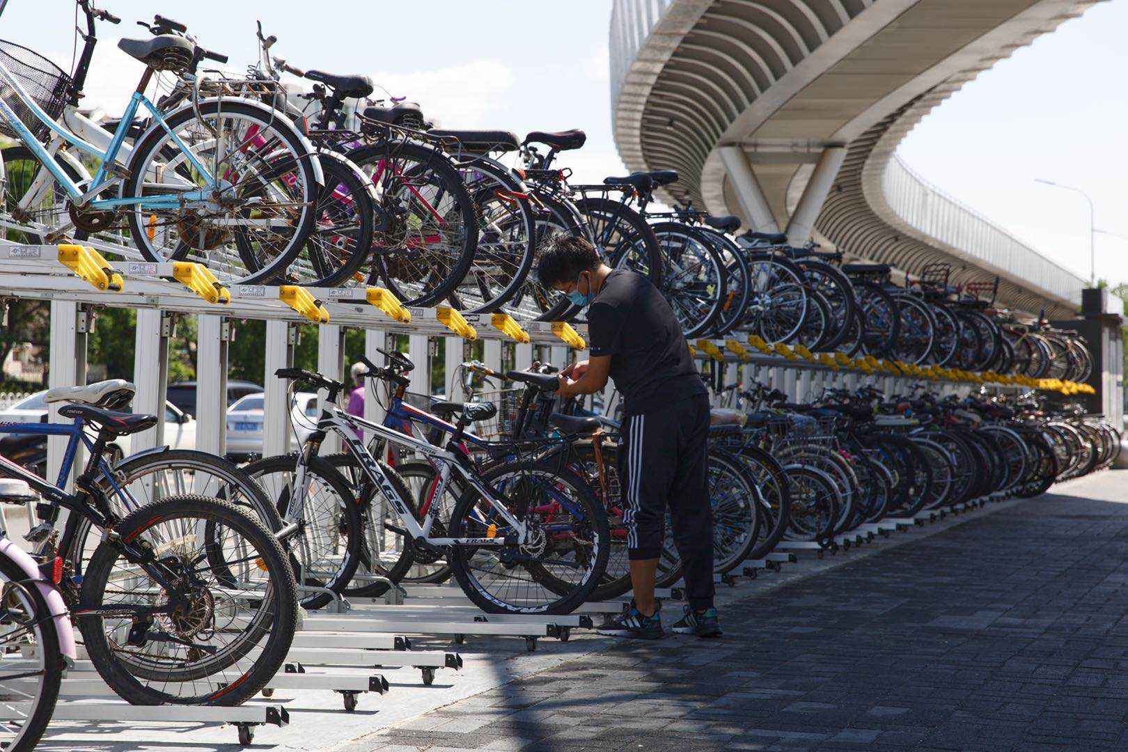 自行车专用路的出入口处设置有立体存车架,可方便停放车辆。摄影/新京报记者 李凯祥