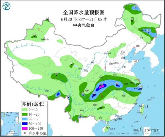 6月20日8时至21日8时,黄淮西部、江汉、江淮西部、江南东北部、陕西东南部、四川盆地东部和南部、贵州北部、云南南部和西部、黑龙江西北部和东南部、吉林北部、青海南部、西藏南部等地有中到大雨,其中,浙江东部、湖北东部和西部、重庆北部和南部、四川东北部、贵州西北部等地的部分地区有暴雨,局地大暴雨(100~120毫米)。