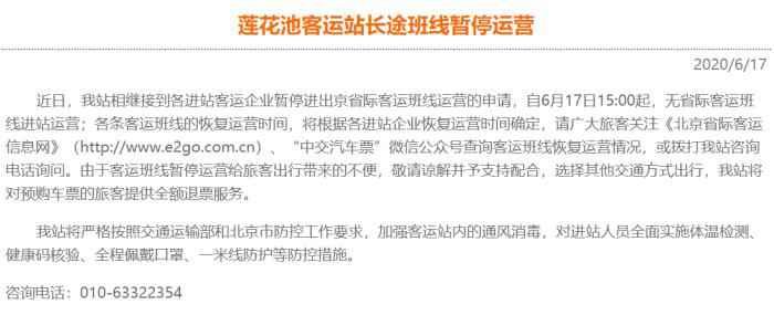 客户端6月18日电 (吴涛)近日,北京多家客运站发公告,长途班线停运,恢复时间待定。永定门客运站公告称,相继接到各进站客运企业暂停进出京省际客运班线运营的申请,自6月17日11:00起,无省际客运班线进站运营;八王坟客运站自6月18日13:50起,无省际客运班线进站运营;莲花池客运站自6月17日15:00起,无省际客运班线进站运营。上述客运站对已预购车票的旅客提供全额退票服务。另外,六里桥客运站17日起,长途班线在陆续停运。