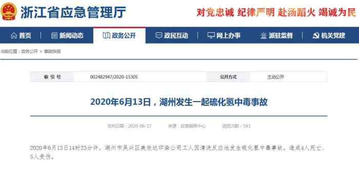 浙江湖州一公司发生硫化氢中毒事故 已致4死5伤