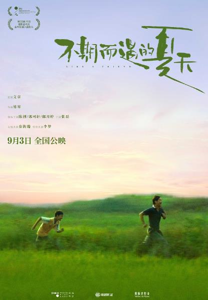 电影《不期而遇的夏天》发布陈奕迅献唱的同名主题曲MV及定档海报,宣布将于9月3日全国公映。该片由文章监制,易寒执导,陈创、郭可轩、郎月婷领衔主演,张磊、欧阳招娣主演,友情出演,李梦特别出演,讲述了失败混混黄四毛(陈创 饰)与怂包学生易水生(郭可轩 饰),两个原本毫无交集的人,成为彼此唯一的朋友的故事。
