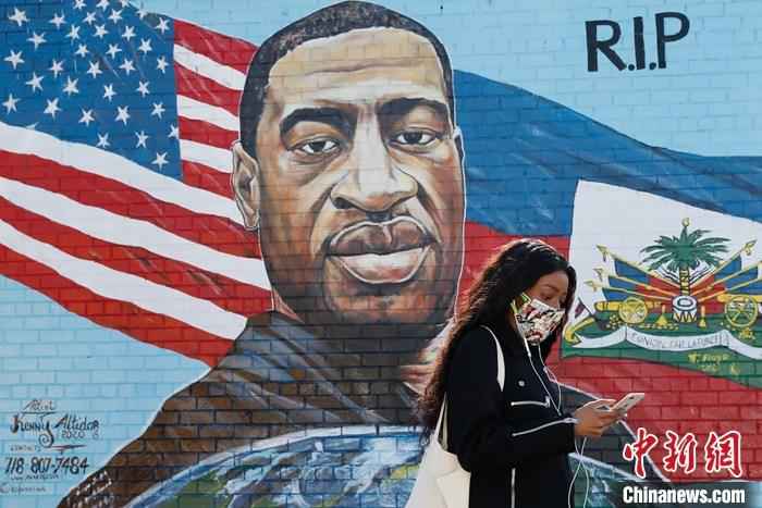 当地时间3月9日,美国纽约布鲁克林区一位市民走过弗洛伊德画像。当日,美国弗洛伊德命案“跪颈”执法前警察德里克·肖万的庭审在明尼苏达州亨内平县法院正式开始。 中新社记者 廖攀 摄