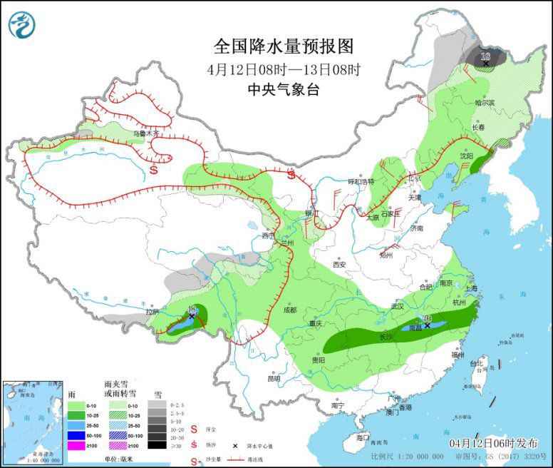 4月12日08时至13日08时,新疆沿天山地区、青海南部、甘肃河西、内蒙古东北部、东北地区中北部等地部分地区有小到中雪或雨夹雪,其中,黑龙江西北部局地有大到暴雪(10~18毫米)。甘肃大部、内蒙古东南部、东北地区南部、华北北部、江南大部、西南地区东部和北部、西藏东部等地部分地区有小到中雨,其中,江西中北部等地局部有大雨(25~48毫米)。宁夏中部、内蒙古中部、黑龙江西南部、辽东半岛、河北大部、山东半岛、河南中部等地部分地区有4~6级风。渤海、黄海大部、东海大部将有6~7级、阵风8级风。