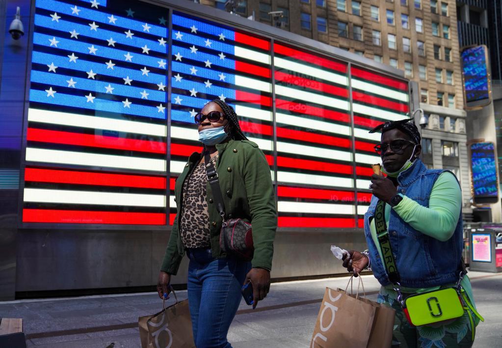 5月14日,人们走在美国纽约时报广场。新华社记者王迎摄