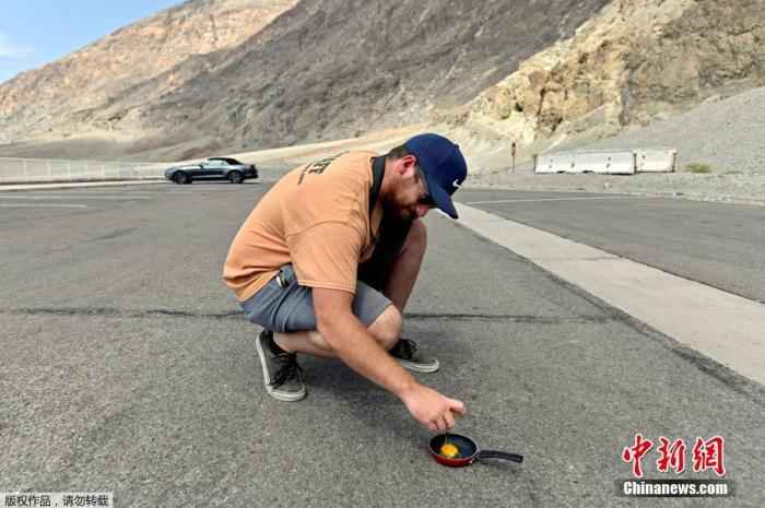 当地时间8月17日,美国加利福尼亚州死亡谷国家公园巴德沃特盆地的停车场,一名男子尝试在地面上煎蛋。