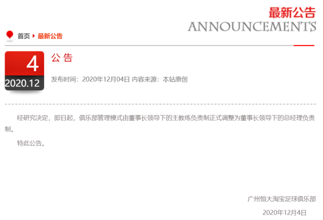 第一条公告是有关俱乐部管理模式的更改,“由董事长领导下的主教练负责制正式调整为董事长领导下的总经理负责制。”