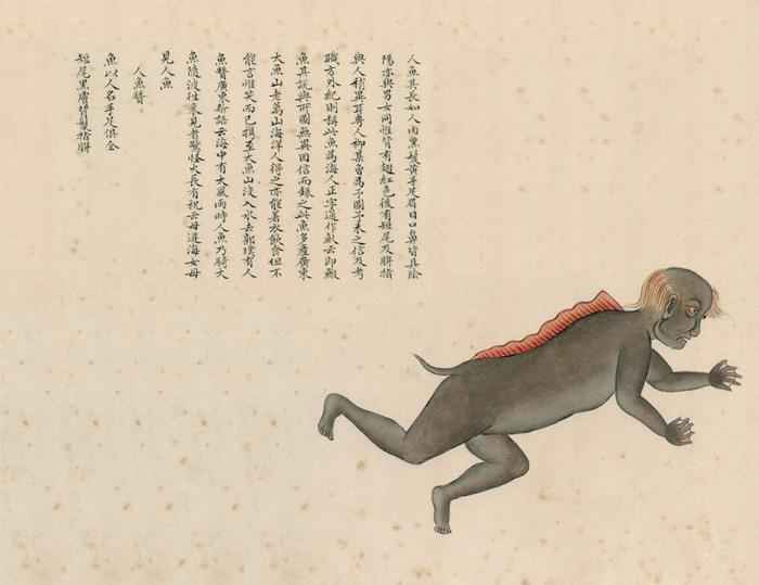 据《海错图笔记》介绍,曾有人给聂璜画过一种生物“人鱼”。他开始没信,因为人鱼长得很奇怪:“其长如人,肉黑发黄,手足、眉目、口鼻皆具……惟背有翅,红色,后有短尾及胼指,与人稍异耳。”